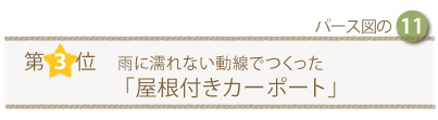 これは、ちょっと意外でした(笑)。てっきり室内が来ると思っていましたが、第3位は庭に設置した屋根付きカーポートです。予算との兼ね合いで、最後まで造るか造らないか悩んだところなので、ご好評をいただけてとてもうれしいです(要望編・完成編)。