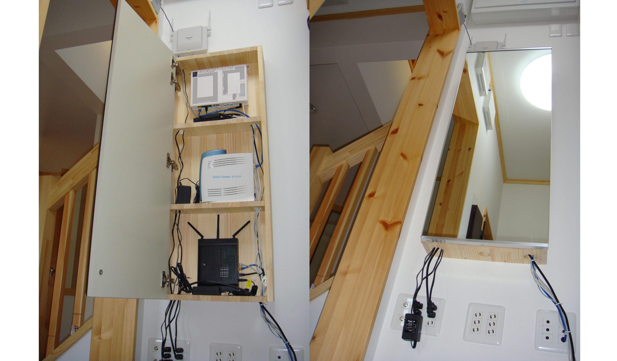 設置した機器は、ONUとVoIPルーター、Wi-Fiルーターです(設置時点)。 鏡としても悪くないと思います♪